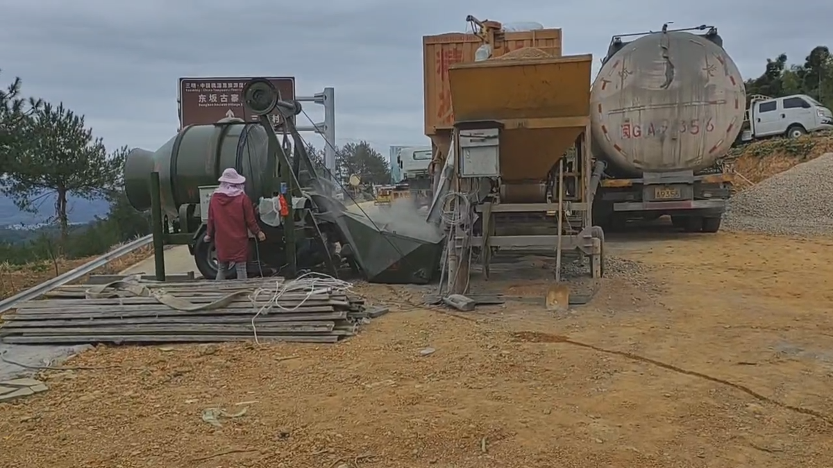高低差形成施工絕佳地形,運(yùn)送混凝土的車(chē)正好在下方接收混凝土,施工效率倍增!